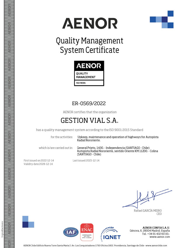 Gestión Vial S.A. (Gesvial) en su camino al desarrollo e instinto de excelencia al servicio de sus clientes y fuerte compromiso con el respeto y cuidado del medio ambiente, se encuentra certificado bajo las normas internacionales ISO 9001 Sistemas de Gestión de la Calidad e ISO 14001 Sistemas de Gestión Ambiental, por lo tanto Gesvial, ha hecho suyo el desafío de impulsar y liderar el compromiso de calidad y de respeto al entorno donde desarrolla sus actividades, asumiendo dos compromisos fundamentales, por un lado el de satisfacer a nuestros clientes y por otro lado el compatibilizar nuestro crecimiento con la protección del medio ambiente.